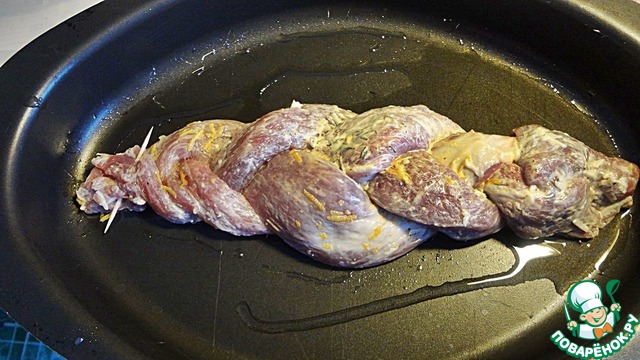 Когда вы будете готовы поставить мясо в духовку, нужно освободить от пищевой плёнки мясо, и аккуратно заплетём нашу косичку. Конец "косы" заколоть зубочисткой (которую вы потом не забудьте вытащить).