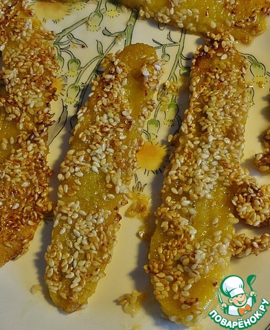 Разрежем их вдоль, смажем одним из оставшихся соусов и запанируем в семечках кунжута.