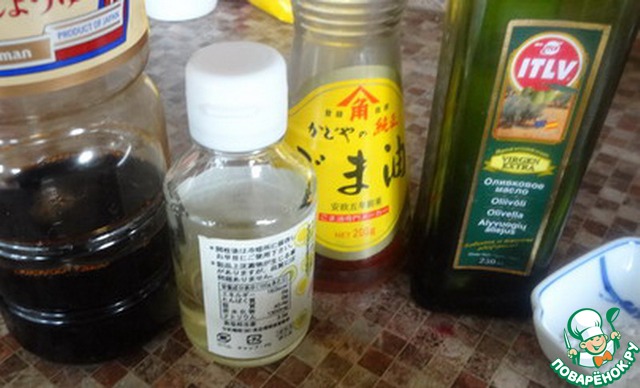 Приготовить оливковое и кунжутное масло. рисовый уксус и соевый соус.