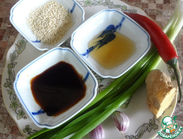 Лук почистить помыть отрезать от корня имбиря примерно 2 см. приготовить кунжут соевый соус и кунжутное масло.