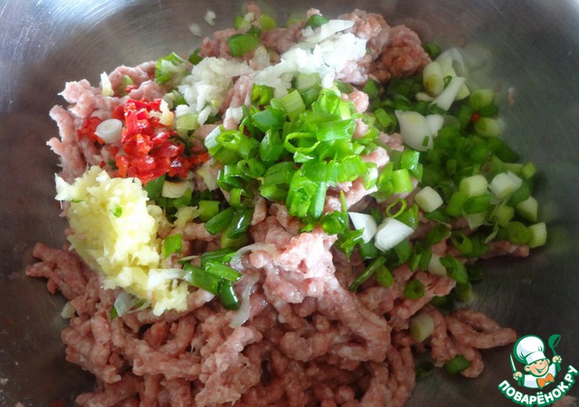 2 стебля зелёного лука порезать. Имбирь натереть на мелкой тёрке, чеснок измельчить. Всё это сложить в фарш, добавить 1 ст. л. соевого соуса и 1ст. л. кунжутного масла. Мелко порезать 1\4перца чили При желании добавить душистый перец. Перемешать. Если не хватает соли, досолить по вкусу. Если котлету будут кушать дети, то от перца лучше отказаться.