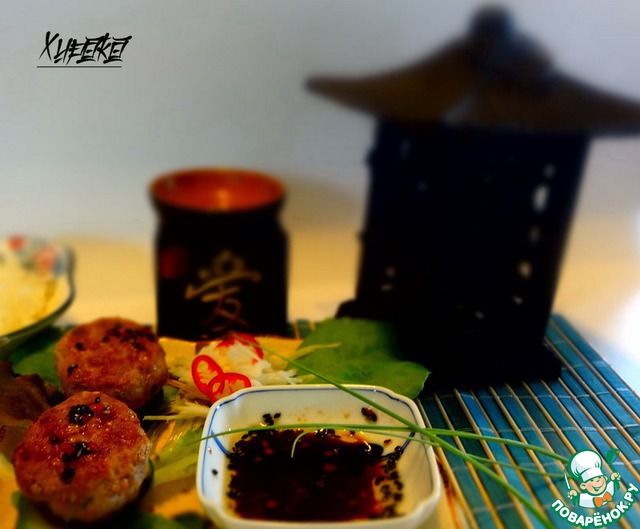 Приготовить соус к котлетам. Для этого смешать в чашке 1 зуб. измельчённого чеснока, мелкопорезанного 1 стебля зелёного лука,4 ст. л. соевого соуса,2 ст. л. рисового уксуса, 1 ст. л. кунжутного масла, 1 ч. л. сахара, 1 ст. л. кунжута и остаток перца чили. Взбить вилкой. Полить немного на котлеты и подать отдельно в соуснике.