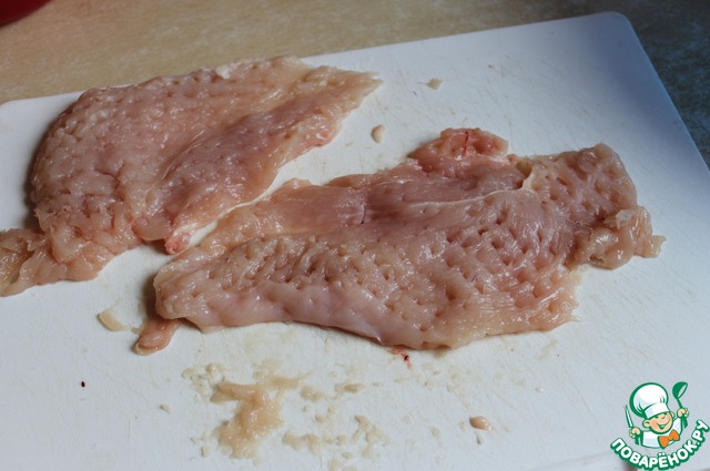 Разрезаем на пласты куриную грудку и отбиваем, подравниваeм под кусок свинины. Тоже солим.