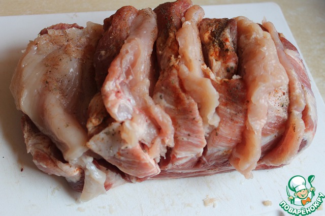 | Как то я бродя по просторам интернета, наткнулась на интересный рецепт. Нужно было взять кусок свинины, разрезать ее повдоль и вставить туда филе курицы. Я решила сделать, но почемуто когда я взяла свинную шею я ее разрезала не повдоль а поперек. Когда спохватилась было уже поздно. Кусок был безнадежно испорчен. Другого куска у меня не было. Ну я решила запекать так. И вот что из этого получилось. Так я изобрела свой рецепт. Вы разрезайте лучше повдоль, но если хотите, можно и поперек! |