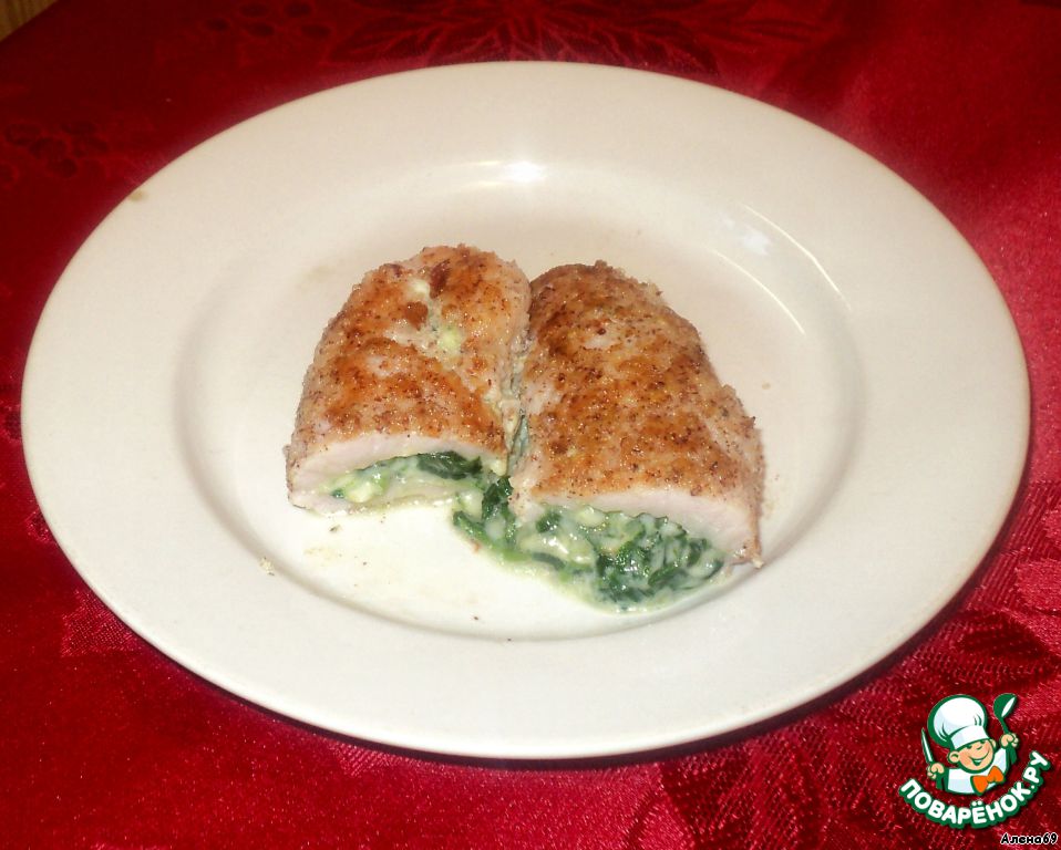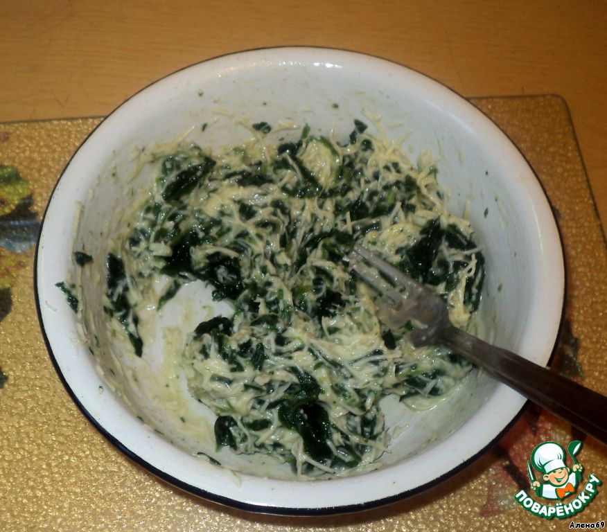 После "Отбивной в тесте" от поваренка xsenia я буквально влюбилась в шпинат. Поэтому выбрала такую начинку.