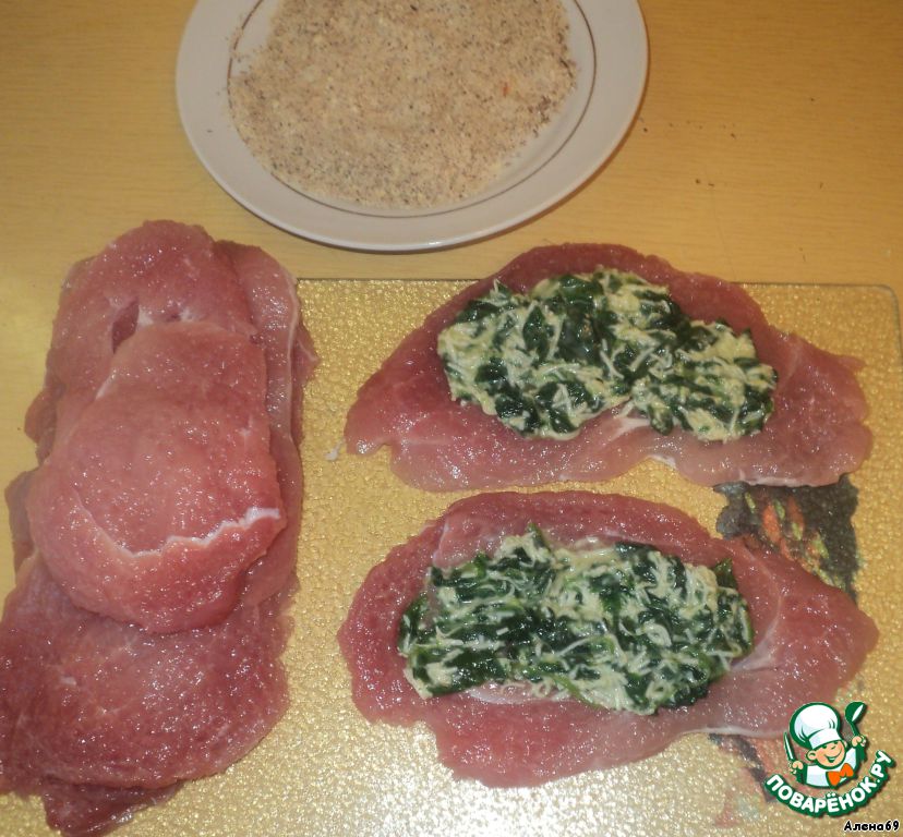 На каждую отбивную кладем начинку, буквально, 1 столовую ложку.