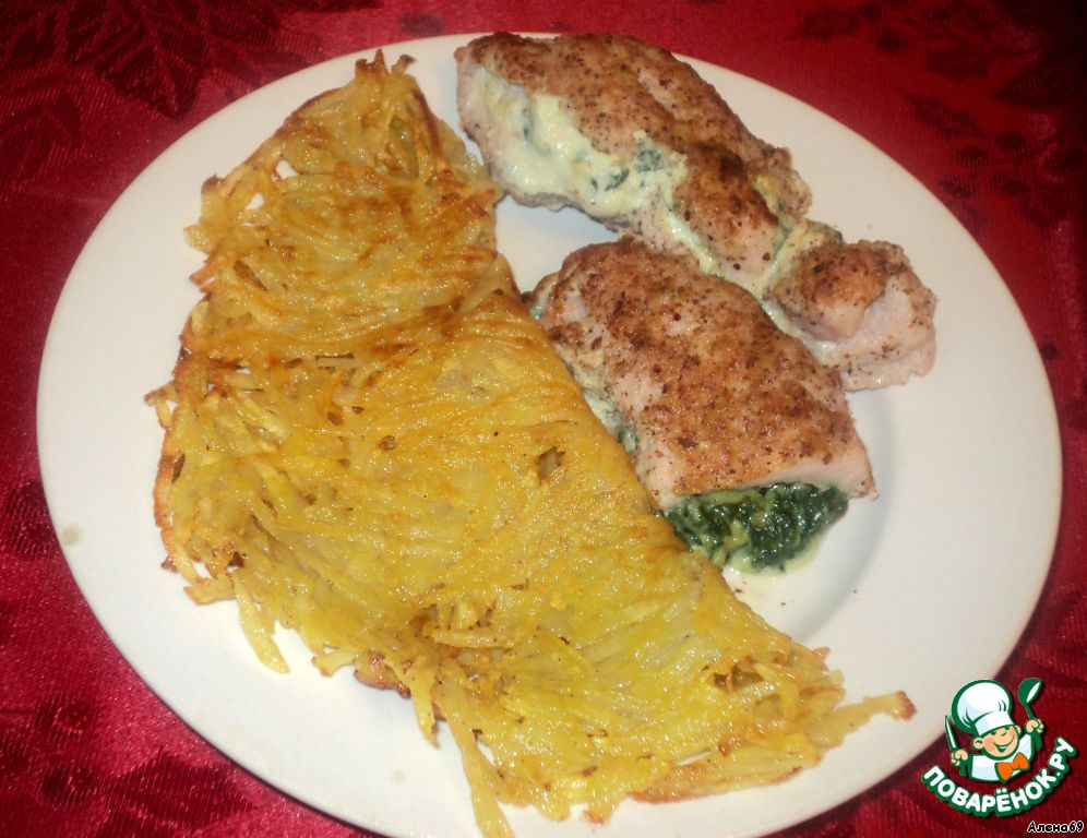 Готовим порционно: трем в крупной терке 1-2 картофелины (количество зависит от размера клубней и Вашей сковороды), выкладываем в разогретое масло, разравниваем лопаточкой так, чтобы получился тонкий блинчик. Солим, перчим, обязательно посыпаем мускатным орехом. Жарим до золотистого цвета пару минут с каждой стороны.