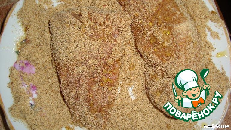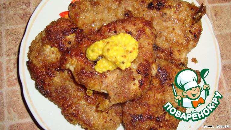 Яйца взбить. Мясо порезать кусочками толщиной около 1 см. Обвалять в яично-горчичной смеси.