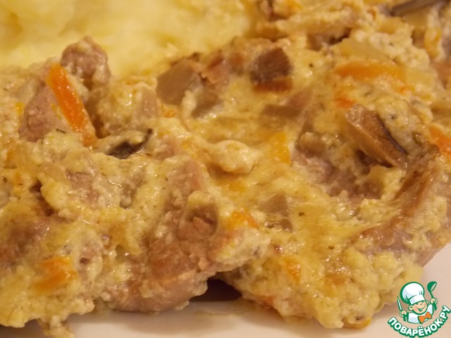 | Мягкое сочное мясо с ароматом грибов и сметанным суфле-соусом. |