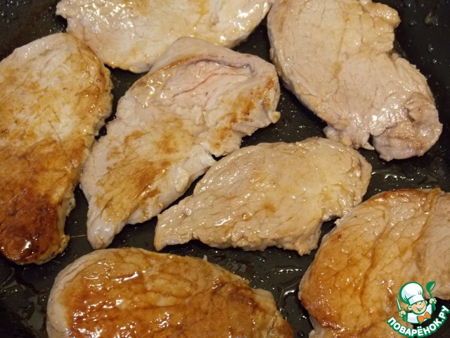 Вырезку промыть и порезать на не большие кусочки поперек волокон. Обжарить в масле с двух сторон. Убрать со сковороды на тарелку.