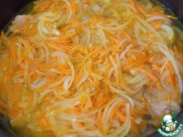 Лук порезать полукольцами, морковь трем на средней терке. Кладем в сковороду после мяса и жарим примерно 5 мин. Сдвигаем на один край. Возвращаем мясо к в сковороду, солим, покрываем зажаркой и вливаем горячую воду. Делаем маленький огонь и тушим примерно 30 мин. Вода должна выкипеть почти полностью. На другой сковороде обжариваем грибы примерно 10 мин.