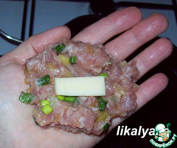 На лепешку фарша выложить брусочек сыра, сверху закрыть фаршем и сформировать небольшую тефтельку.