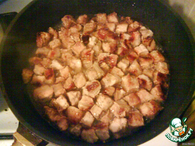 Мясо нарезать кубиками 1,5-2 см, посолить, поперчить, обжарить (я с добавлением растительного масла).