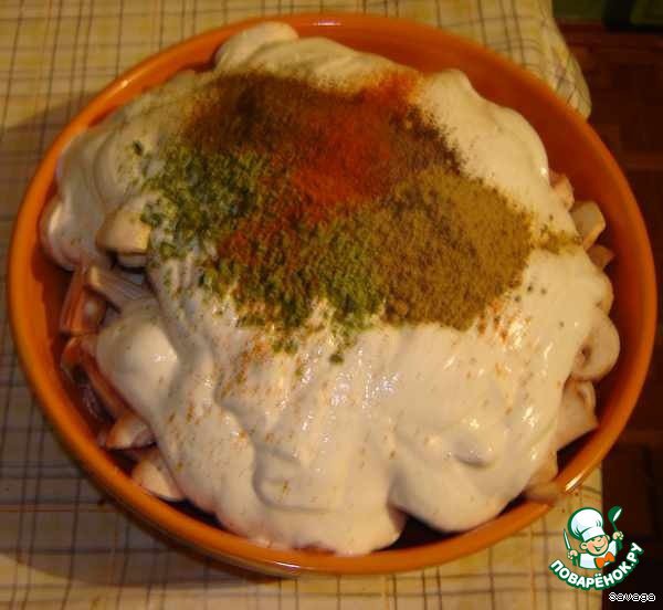 Все это дело заливаем сметаной, солим, перчим, добавляем хмели-сунели, приправу для свинины и т.п. по вкусу.