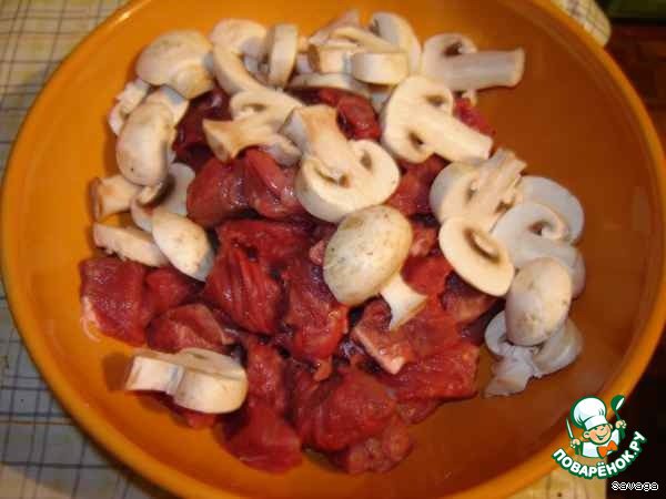 Туда же режем грибочки (разрезая их вдоль на 3-4 части)