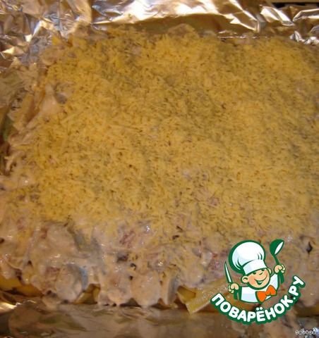 Сверху картошку равномерным слоем покрываем мясом с грибами и посыпаем тертым сыром. Сыр можно добавить и в конце, но мне больше нравится, когда он дает подсохшую корочку. А можно и вообще без сыра делать - тоже неплохо получается)))