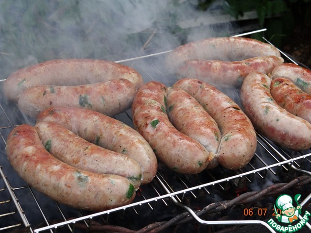Жарить колбаски на решетке (смазанной маслом) на подготовленных углях примерно 15-18 минут, часто переворачивая — не пережаривать!