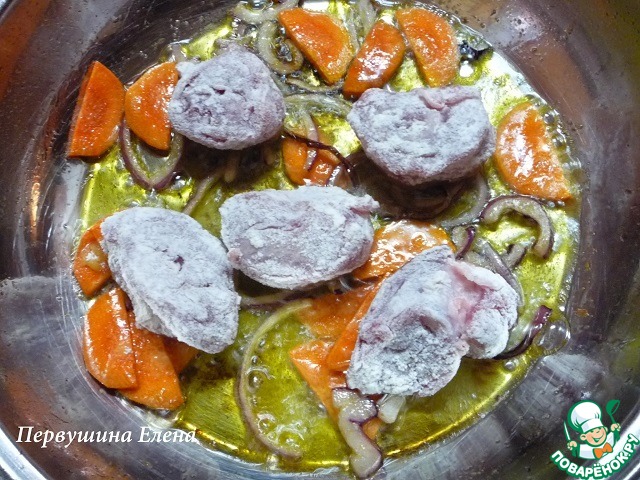 Обвалять мясо в муке, отряхнув лишнюю. Должна быть лишь легкая мучная «глазурь».