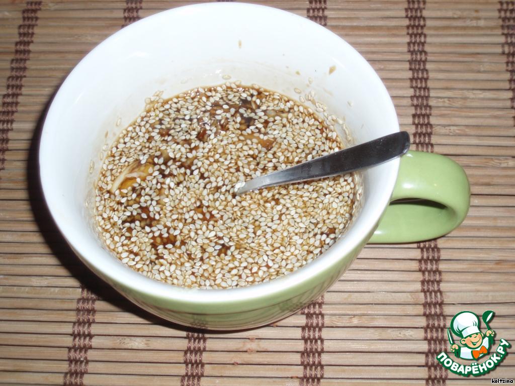 Сначала приготовим нашу заливку-соус. Для этого возьмём небольшую мисочку и нальём туда соевый соус.