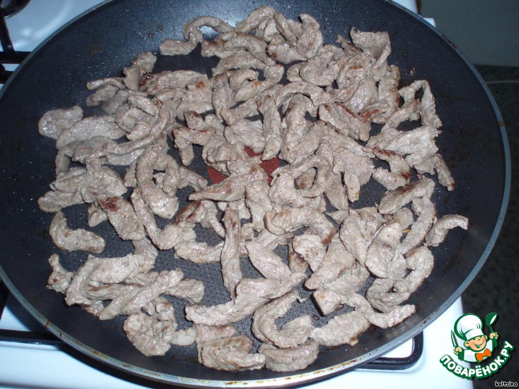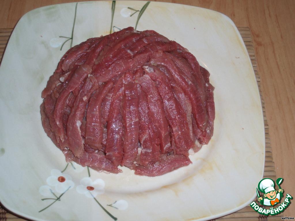 Мясо нарезаем на тоненькие полосочки, у меня вышла вот такая горка.