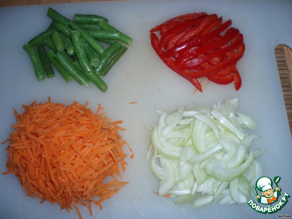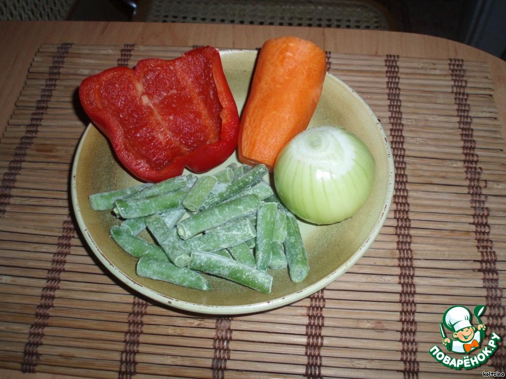 Берём вот такое количество продуктов (лук, болгарский перец, морковь и стручковая фасоль).