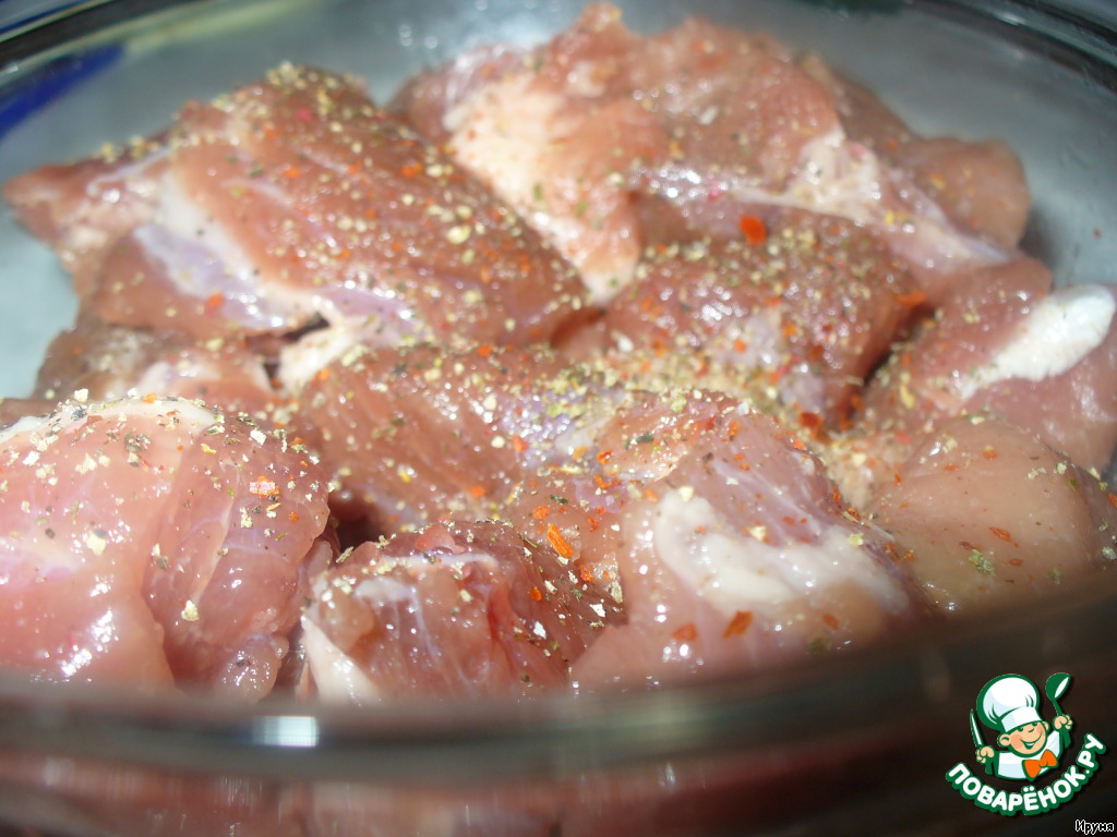 Свинину режем средними кубиками, если готовим дома на плите, если на мангале на шампурах, то кусочки покрупнее. Складываем в ёмкость, натираем солью и свежемолотой смесью перцев.