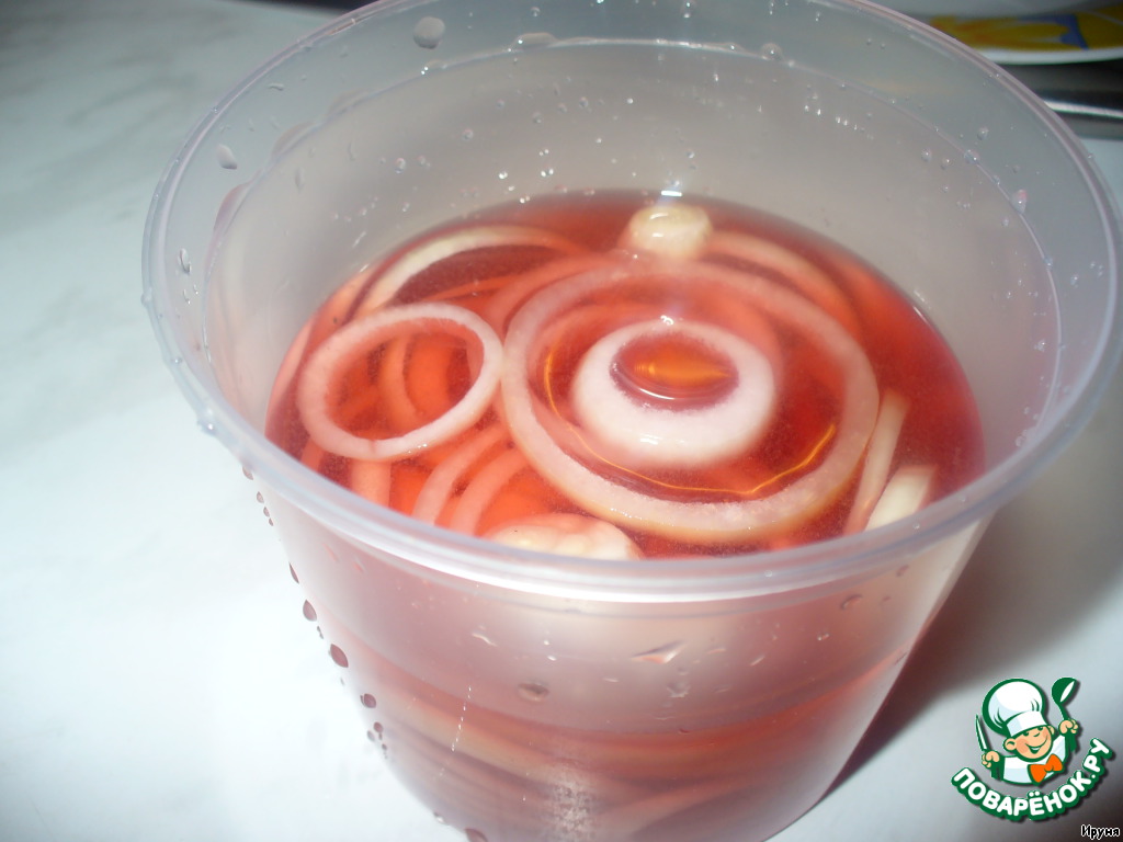 Третью луковицу, нарезанную кольцами, замаринуем отдельно в таком же маринаде (вода и малиновый уксус 1:1)
