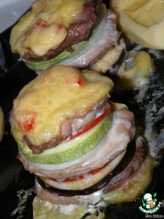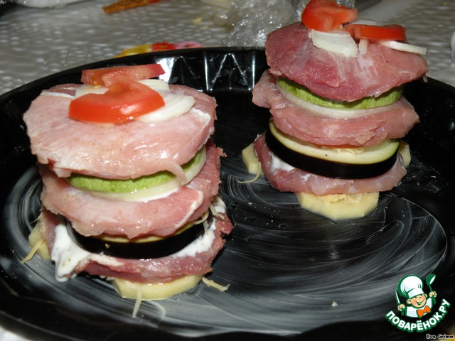 Складываем башенку в любом порядке чередуя мясо и овощи