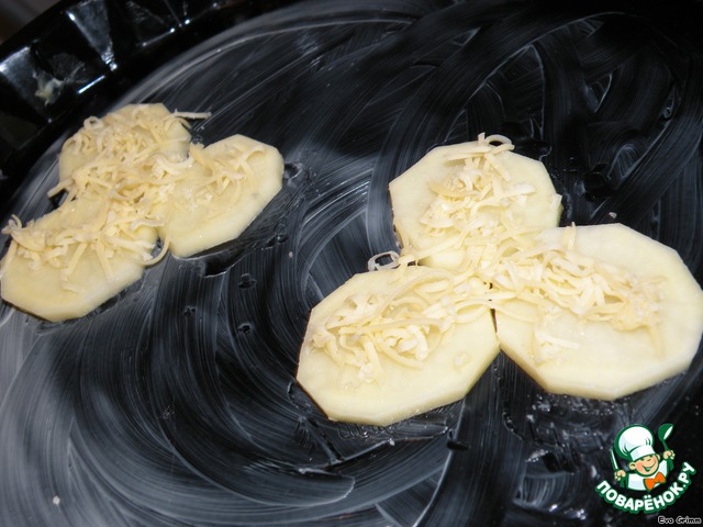 Выкладываем на дно формы картофель, добавляем специи и немного сыра