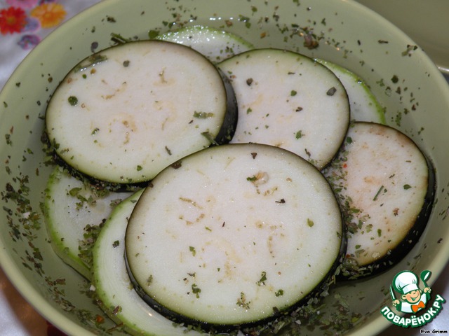 Кабачок и баклажан нарезать, замачиваем на 10 минут в подсоленной воде