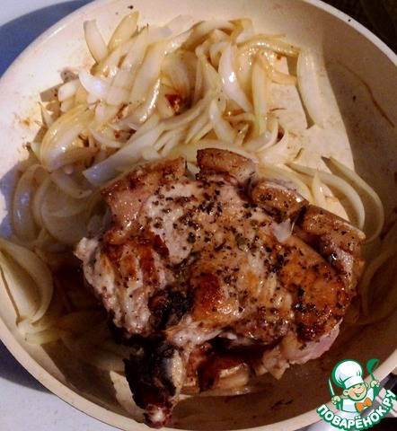 Поднимите кусок мяса, разместите на его месте лук, дайте луку вобрать в себя зарумянившийся сок мяса со сковороды.