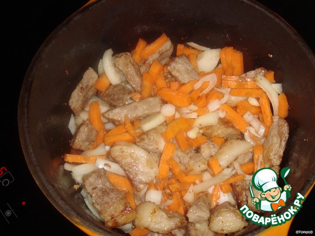 После того как мясо обжарилось, добавляем нарезанные морковь и лук.