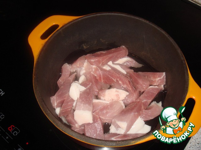 Режем ломтиками 600 гр свинины и кладем в казан с разогретым подсолнечным маслом. Жарим в течение 30 мин. до румяности.