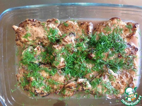 Поджаренное мясо уложить в форму. полить оставшимся маринадом, вылить вторую рюмку водки в мясо. посыпать укропом (по желанию).