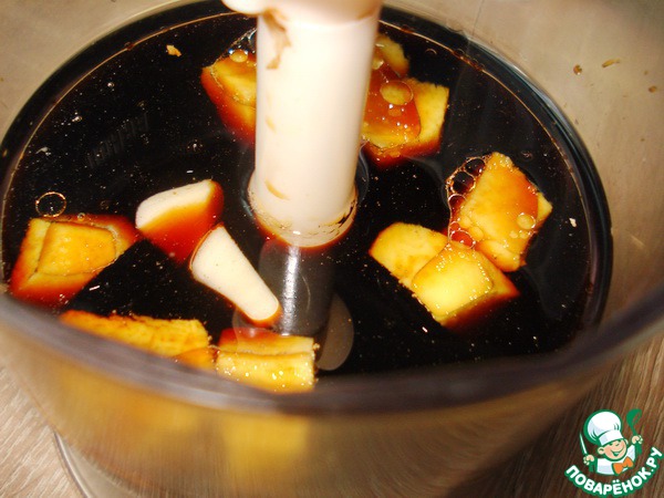 Соевый соус, сахар, мед, чеснок, очищенный имбирь, растительное масло, уксус, воду поместим в блендер и взобьем.