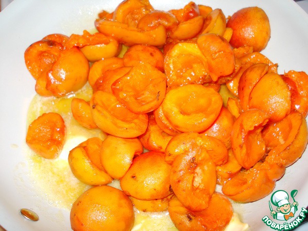 Обжарьте на среднем огне минут 5. Потом добавьте яблочный сок. У меня абрикосы были очень сочные, спелые, мне хватило этого количества жидкости, вы можете добавить еще немного воды.