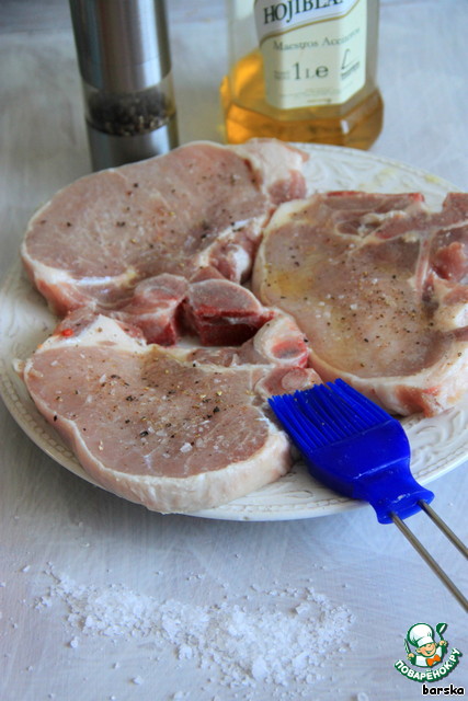 Свиные котлеты на косточке помыть, обсушить бумажными полотенцами. Смазать с помощью кисточки оливковым маслом, посолить крупной морской солью и поперчить свежемолотым чёрным перцем с обеих сторон.