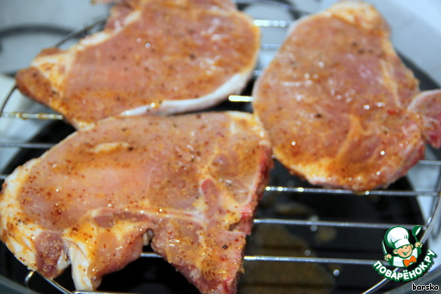 Решётку смазать маслом и выложить на неё свиные котлеты. Жарить на решётке до готовности по 12-15 мин. с каждой стороны. Можно - на гриле, в разогретой духовке или в аэрогриле (предварительно всё должно быть разогрето)!