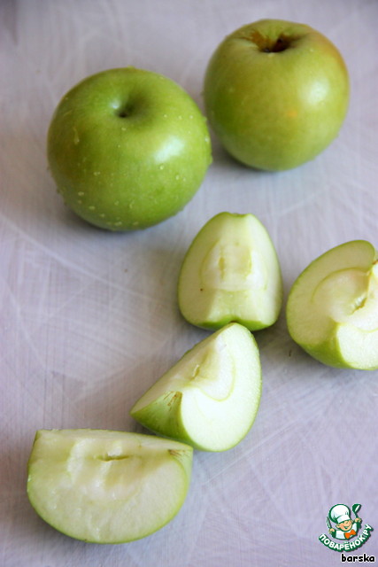Яблоки помыть, нарезать четвертинками (у меня - зелёные, Гранни Смит), смазать соусом-маринадом и быстро поджарить, чтобы сохранились формы.