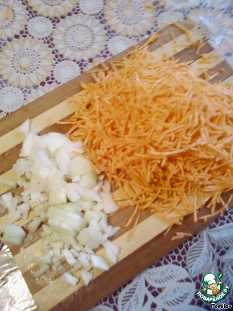 Лук порезать кусочками, морковь соломкой. Высыпать на разогретую сковородку, накрыть крышкой, потушить минут 5.