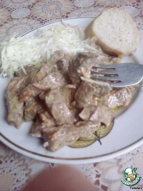 Переложить печень, убавить огонь под сковородкой, протомить под крышкой минуты 3, влить сливки (10% жирности). Тушить ещё 5-7 минут.