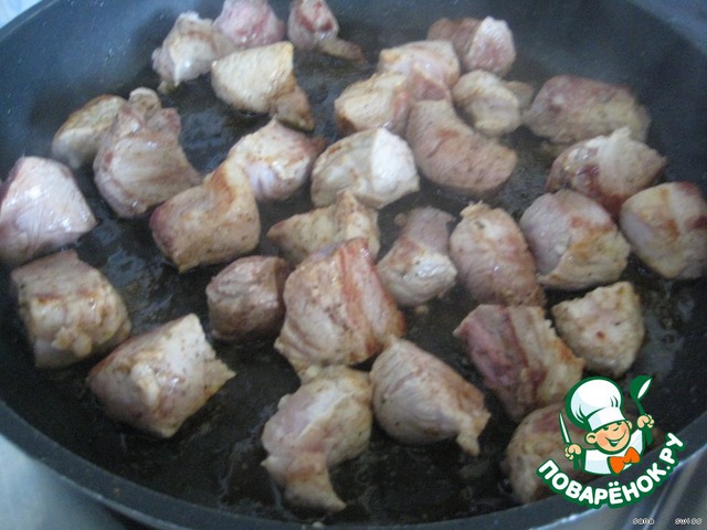 На разогретом масле в сковороде на сильном огне обжариваем кусочки свинины, пока не покроются румяной корочкой.