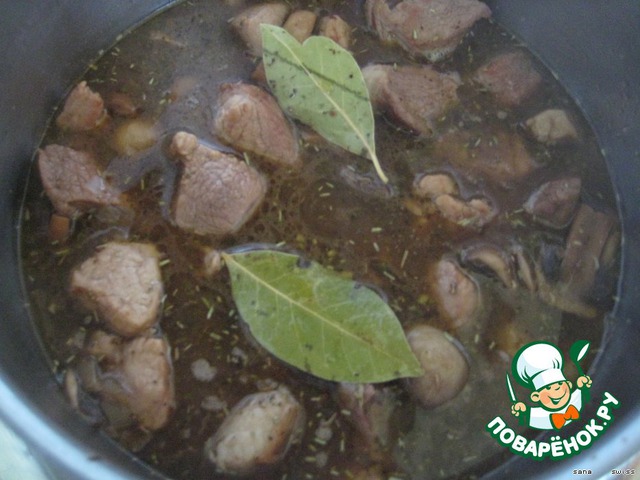 Убавляем слегка огонь и добавляем лук и грибы, жарим, пока не подрумянятся, помешивая, солим, перчим, добавляем порто, вино, прованские травы, лавровый лист, доливаем бульон, что бы покрыло мясо и тушим, на небольшом огне, пока свинина не станет мягкой.