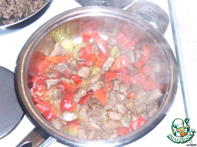Перец также нарезаем соломкой средними кусочками, не мельчите, иначе перец разварится, а он должен чувствоваться. Лучше всего свежий красный перец, но если его нет можно и из пачки замороженный, цвет перца влияет только на вид блюда :-) .