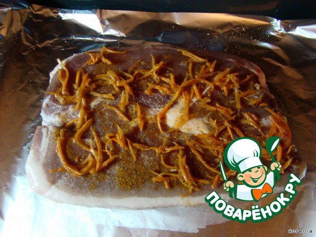 Теперь с обеих сторон на свинину выкладываем по 3 ст.л. корейскую морковку