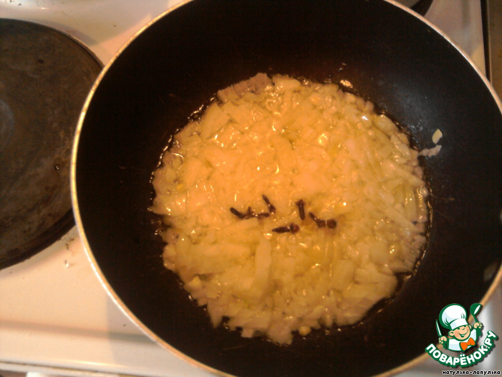 Лук нарезать мелко и обжарить на растительном масле до золотистого цвета с добавлением гвоздики.