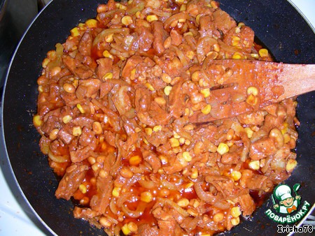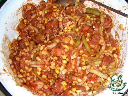 Свинину режем брусочками, к ней добавляем кукурузу, фасоль, репчатый лук, сладкий перец, томатную пасту, приправу(кто какую любит), зелень.