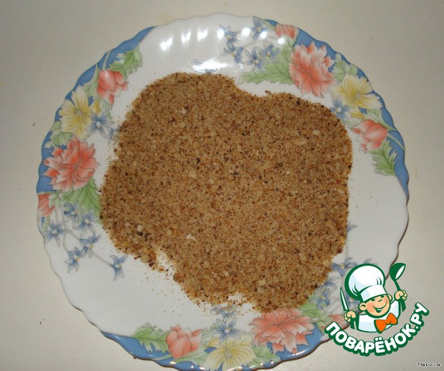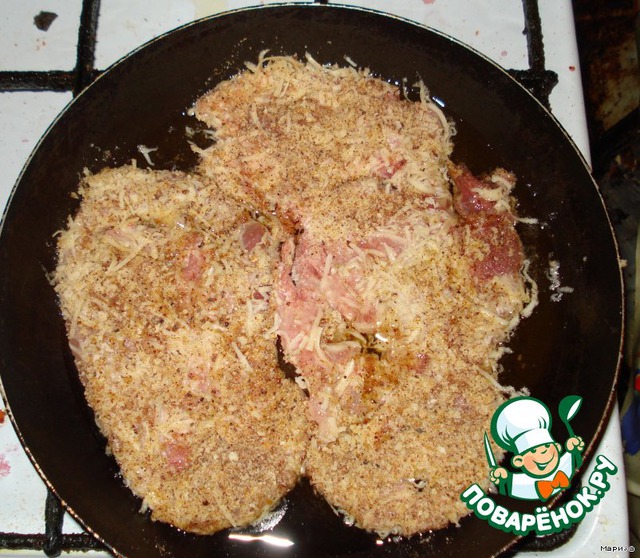 Каждый ломтик свинины обвалять сначала в муке, затем опустить во взбитое яйцо. Перенести мясо на тарелку с тертым сыром и хорошенько прижать. И наконец обвалять мясо в сухарях.