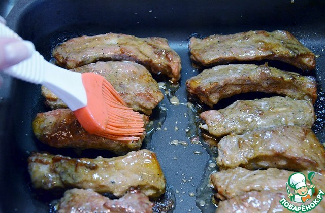 Запекаем в разогретой до 200 градусов духовке около 30 минут. Во время запекания периодически смазываем ребра маринадом.