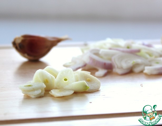 Нарежьте тонкими полукольцами 2 луковицы и тонкими пластинками 4-5 зубков чеснока